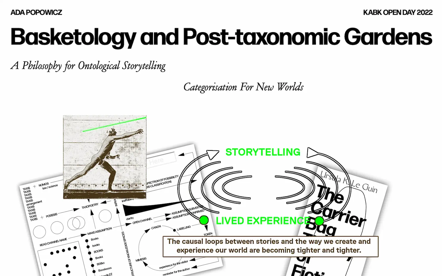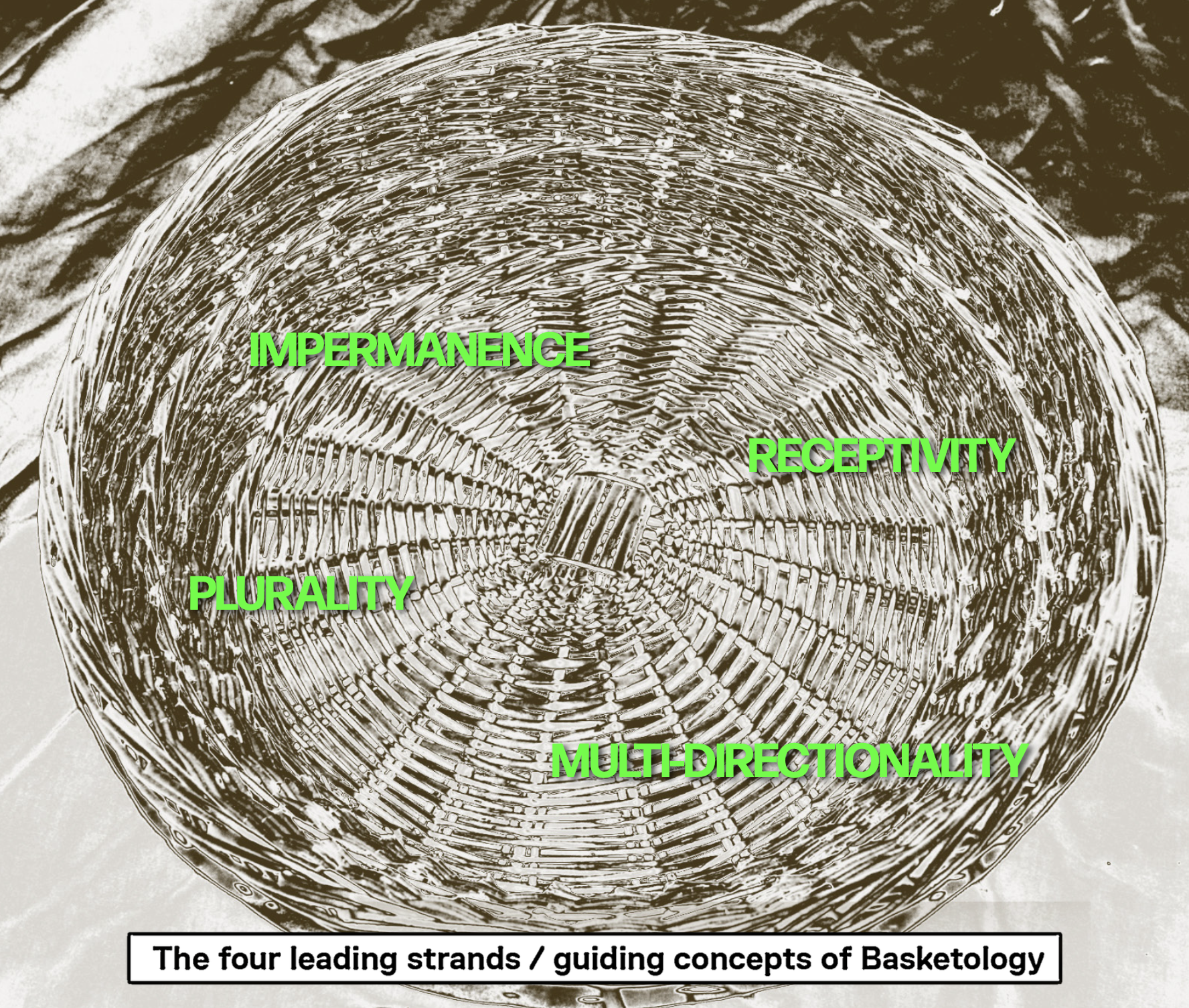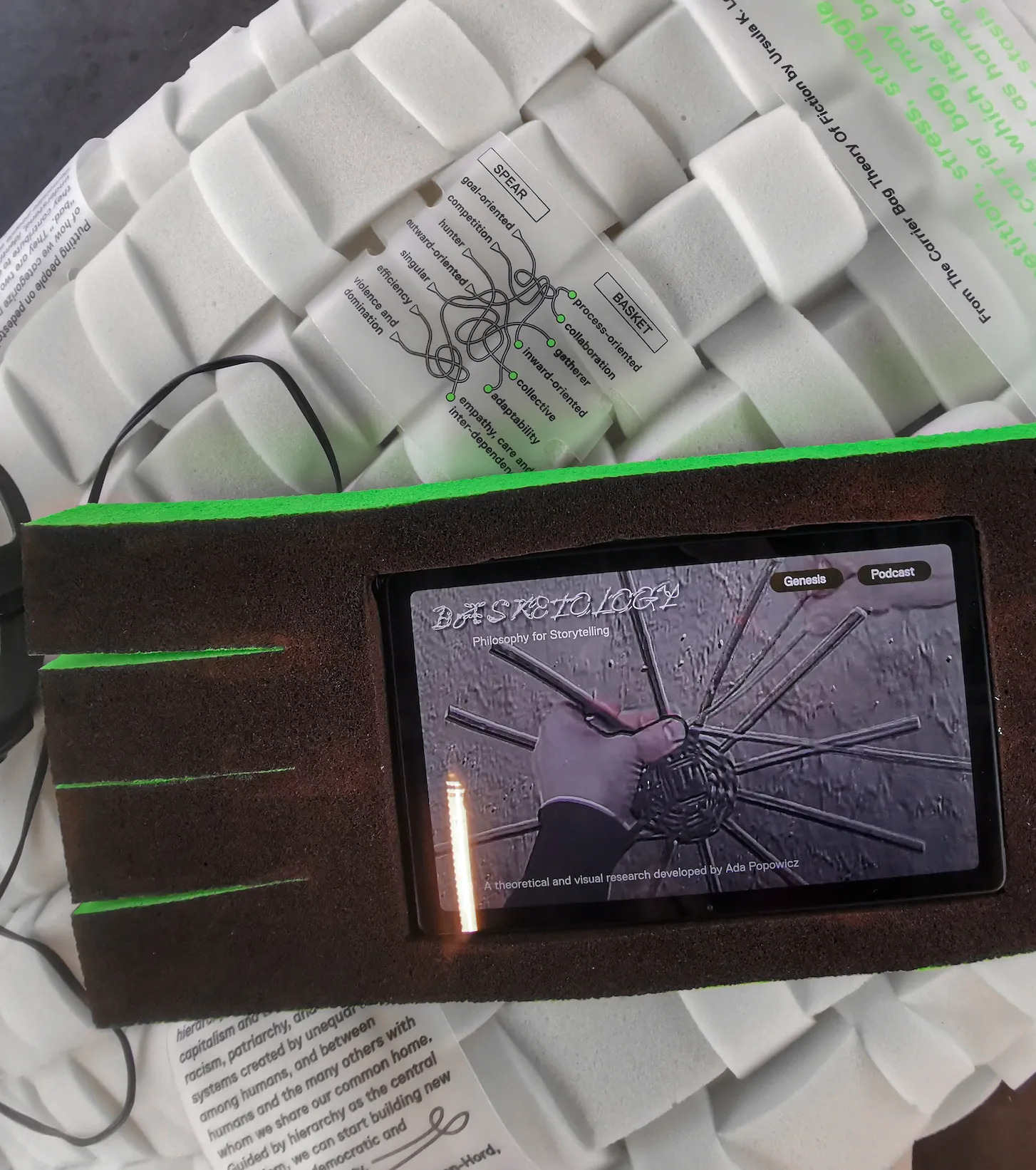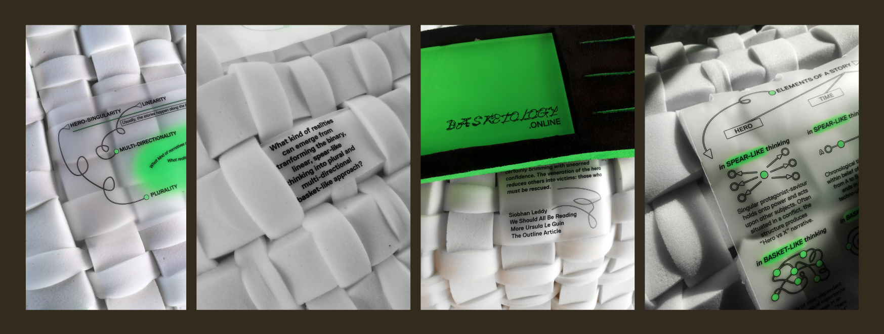 Inspired by Le Guin’s essay I started looking into frameworks of storytelling and researched how they can be mapped and defined in the basket-spear terms introduced by the author. Through Basketology, I wanted to challenge the dominant, binary, and patriarchal narratives. In order to do so, I used the physical and cultural symbolism of the basket as a metaphorical guide for re-examining the ways in which we tell stories and socio-political structures that emerge from them. The project explores how the basket’s associations with care, collaboration, and resourcefulness can inspire new ways of defining identity and community within our existing cultural landscape.