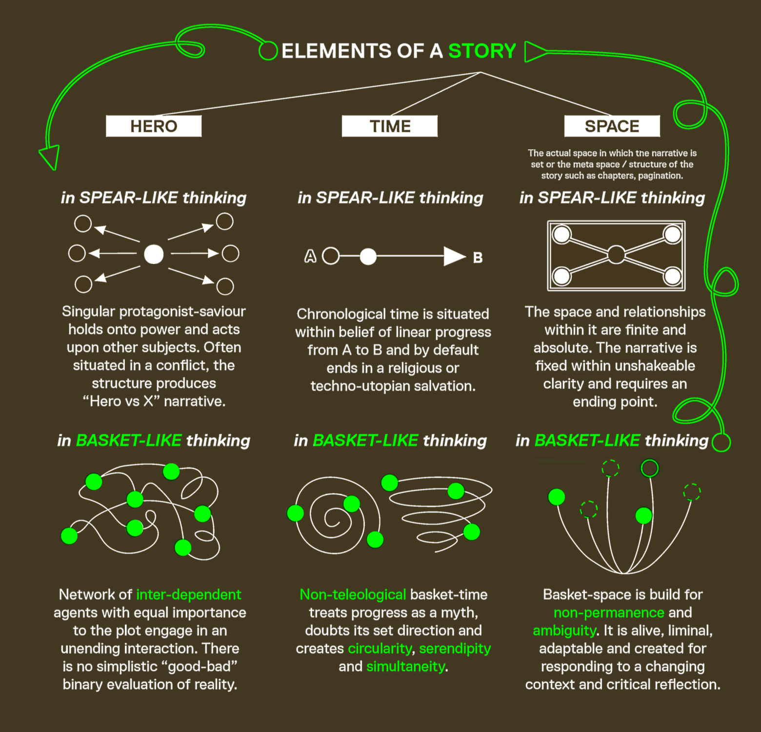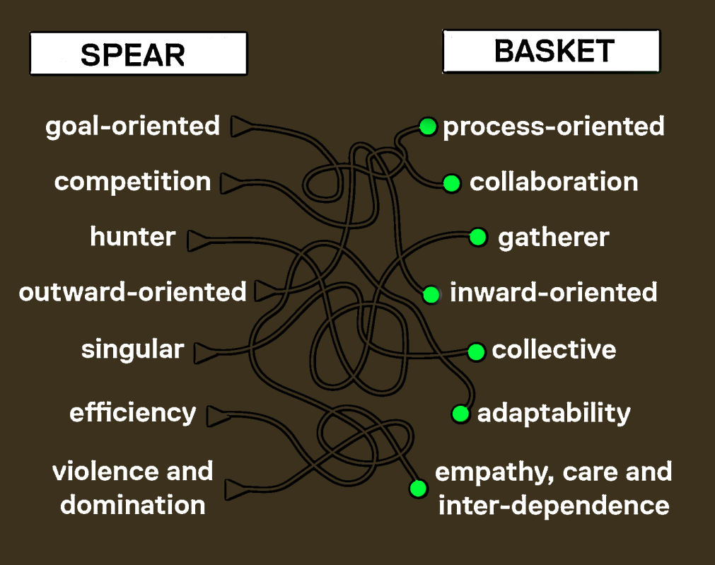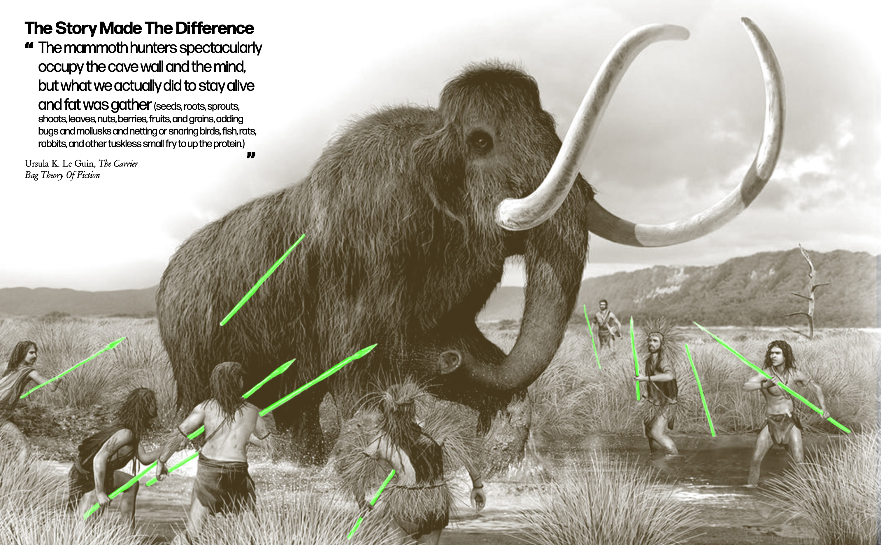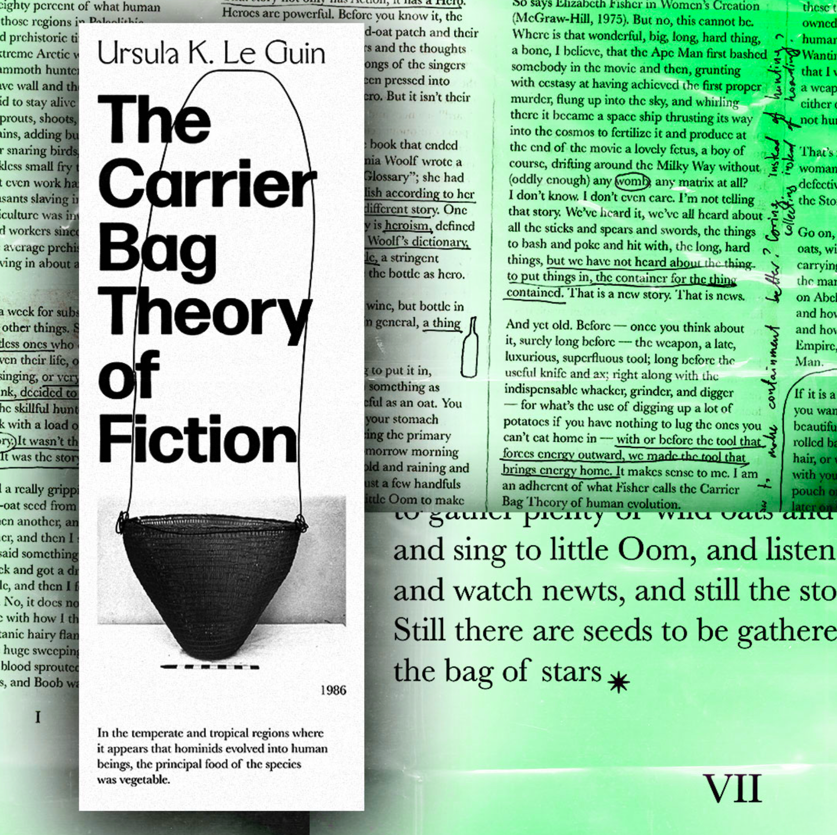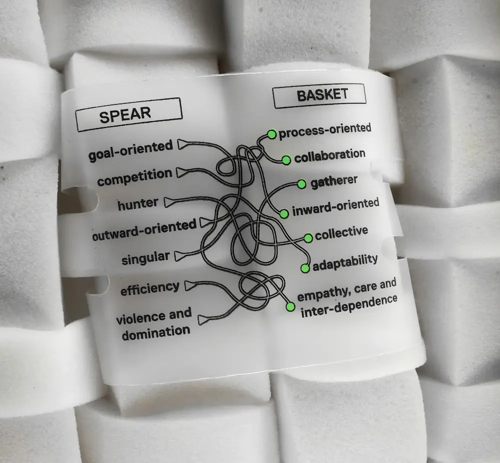 In The Carrier Bag Theory of Fiction (1986), Ursula K. Le Guin proposes that humanity’s first cultural tool was not the spear, a symbol of violence and dominance, but the basket, a vessel for gathering and sustaining life. The spear, however, became the central figure in cultural storytelling, as the narratives of heroic individualism—like killing a mammoth—are easier to convey than the collective, nurturing efforts of activities like fruit-picking, gathering or weaving.