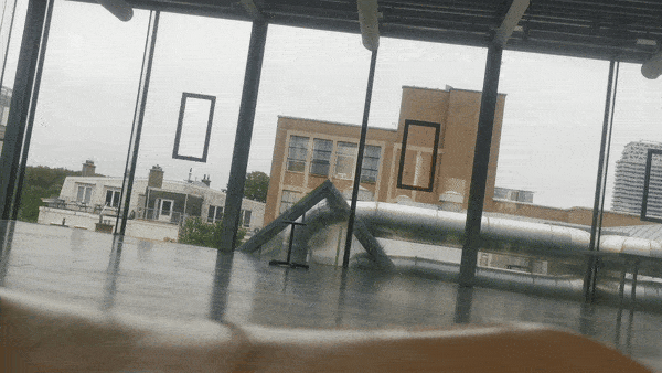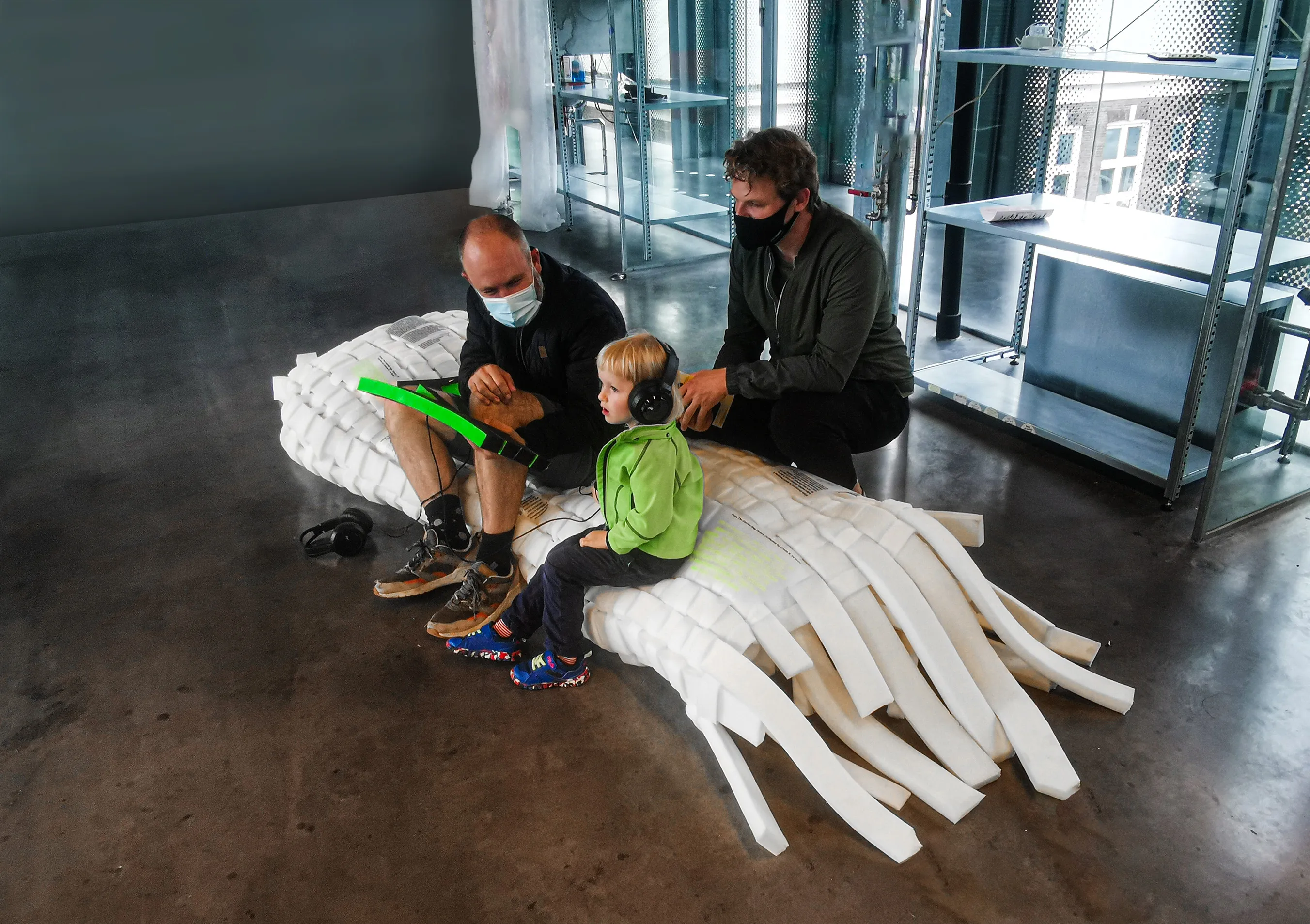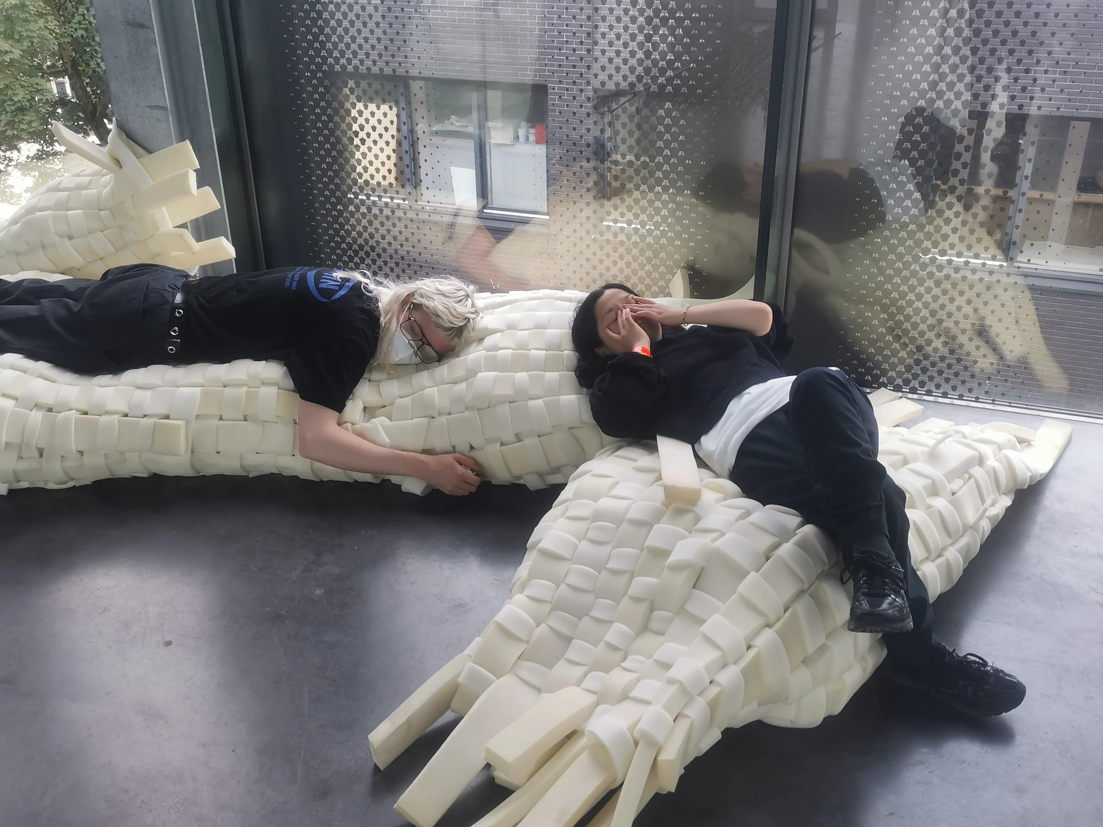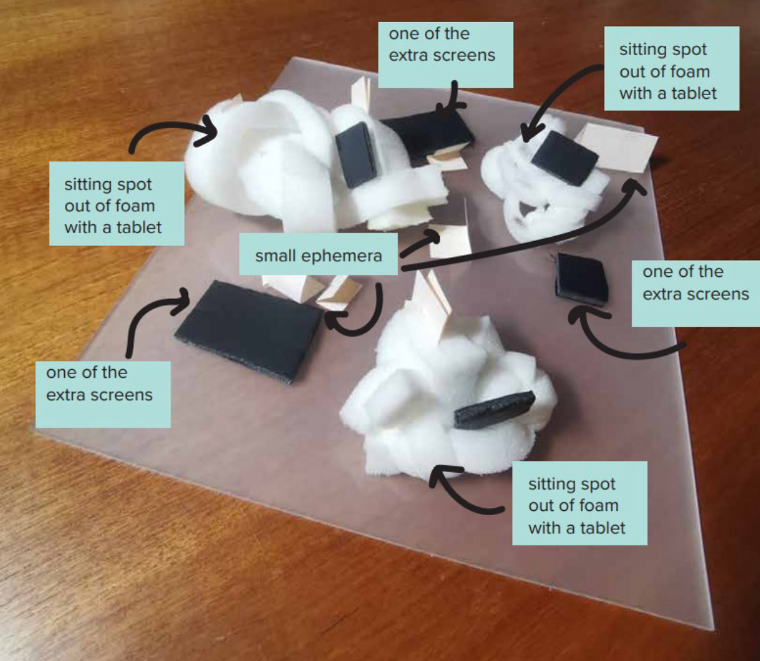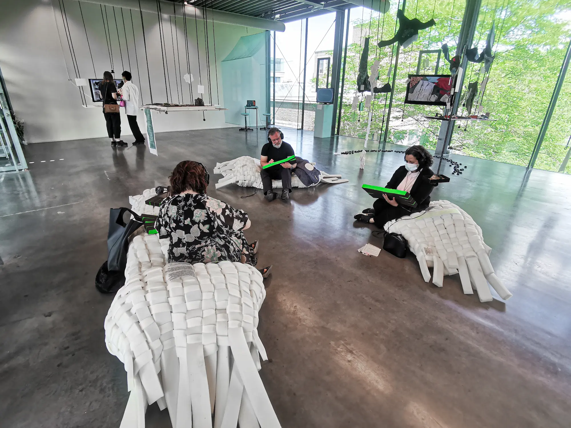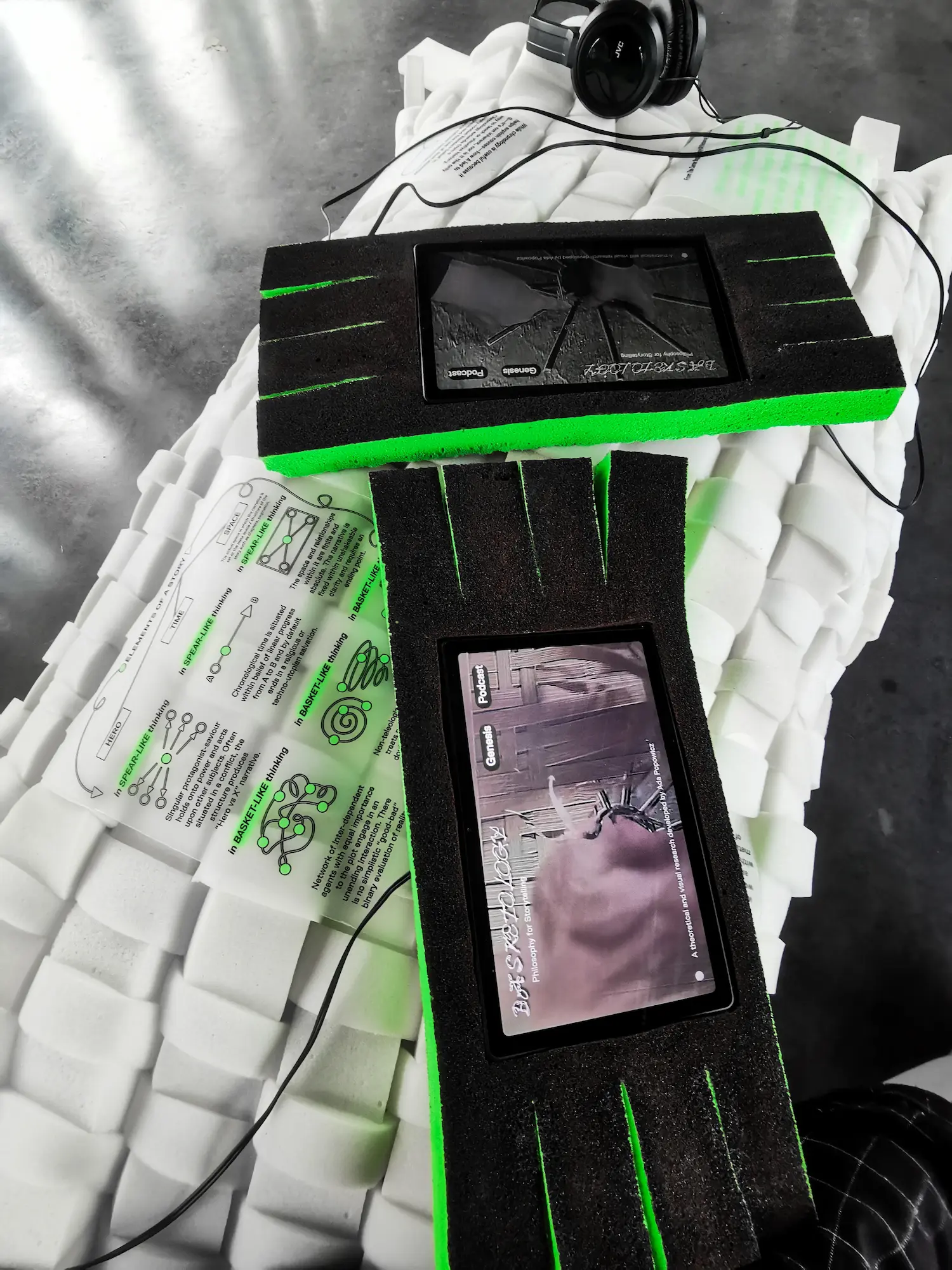 Each bag-like seat had a holder for a tablet, where the Basketology website was displayed. Headphones were attached for a comfortable listening experience. The tablet holders had cuts at the ends which allowed them to be easily woven into the furniture. Additionally, into the seats, I have woven quotes, diagrams and other elements of the project. Screen-printed on transparent sheets, they could be perfectly interconnected with the furniture and easily moved around.