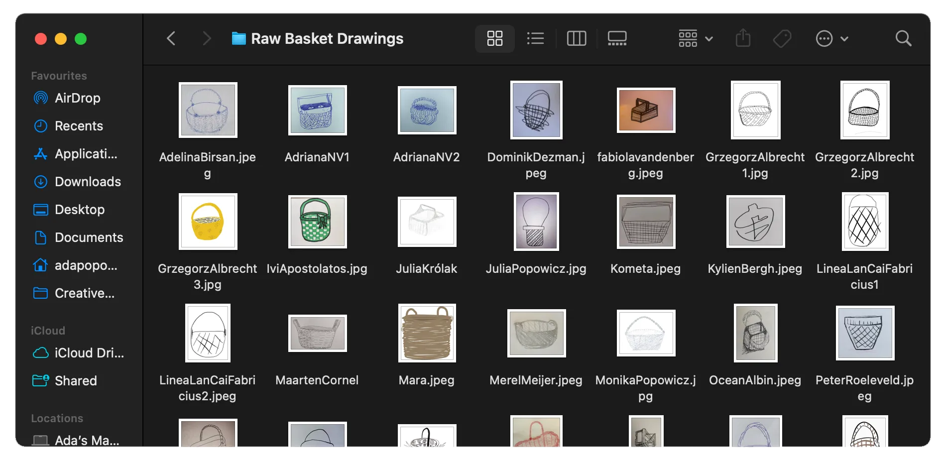After every interview, the experts were asked to a draw a basket, a simple or as complex as they wished. The collected drawings, from both experts and other people who provided tem, created a valuable archive of what an idea of a basket looks like to different individuals. The interviewees’ basket drawings were later used as the covers of their podcast episodes on the basketology website.